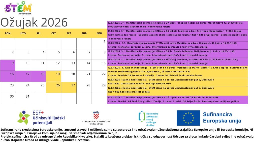 Nakon proljetnih školskih praznika, projekt STEM čarobni svijet nastavlja s interaktivnim aktivnostima diljem Hrvatske. Tijekom travnja 2026., STEM čarobni svijet manifestacije donose znanost bliže djeci, mladima i svim zainteresiranim građanima u Šibeniku, Rijeci, Zagrebu, Kninu i Kistanjama.